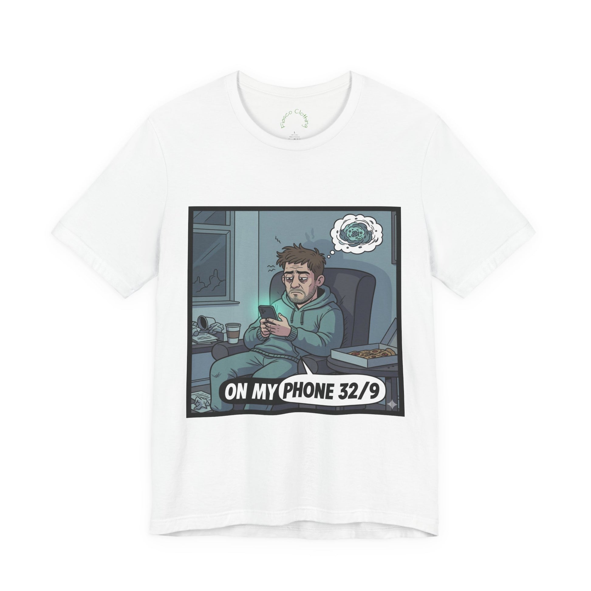 A soft, breathable tee with a tongue-in-cheek comic print that captures the late-night scrolling, bleary-eyed vibe of digital life. The art shows a tired person hunched in a cozy room, phone glowing, and the caption “ON MY PHONE 32/9” — a wry nod to endless screen time. Lightweight Airlume cotton keeps the shirt comfortable whether layered under a jacket or worn alone. Built with thoughtful construction—side seams, ribbed collar, shoulder tape and a tear-away label—this shirt stays shaped and comfortable through repeated wear. The print uses modern DTF/DTG methods for sharp detail and vibrant color. Ethically produced blanks and REACH certification mean you’re choosing responsibly as well as stylishly.